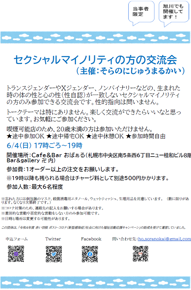 6月4日(日)に、空の会/そらのにじゅうまるかい様主催の、トランスジェンダー、Xジェンダー、ノンバイナリなど「割り当てられた性と性アイデンティティが一致しない」当事者の交流会がございます。