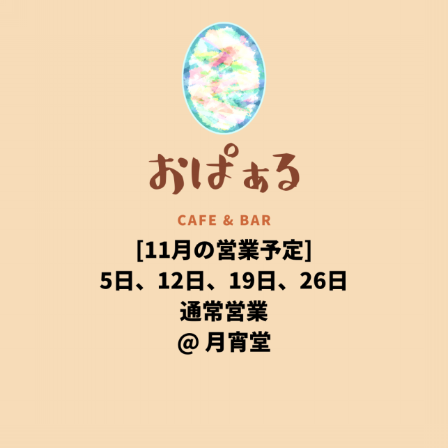 おぱぁるの11月は、5日(日)、12日(日)、19日(日)、26日(日)の営業予定です。