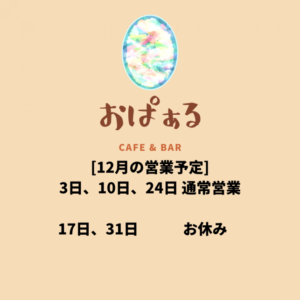おぱぁるの12月は、3日(日)、10日(日)、24日(日)の営業予定です。