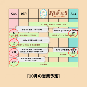 おぱぁるの10月は、6日(日)、13日(日)、20日(日)、27日(日)の営業を予定しております。