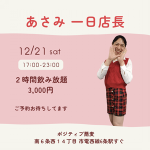 12月21日(土)は西線6条近くの「ポジティブ蕎麦」さんにてあさみママが一日店長します。