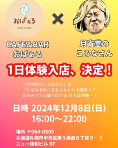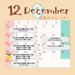 おぱぁるの12月は、1日(日)、8日(日)、15日(日)、22日(日)、29日(日)の営業を予定しております。