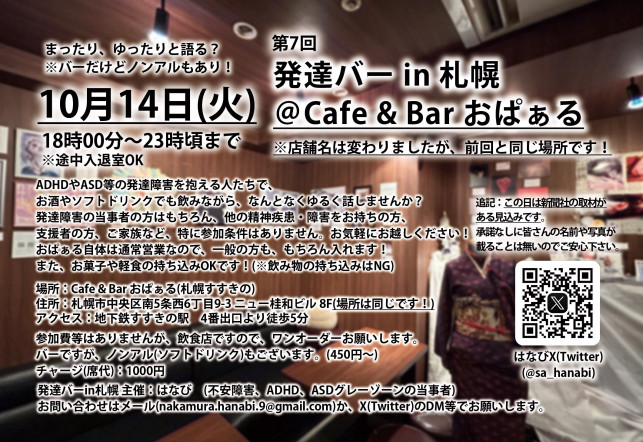 はなびさん主催の発達バーを10月14日に開催いたします。