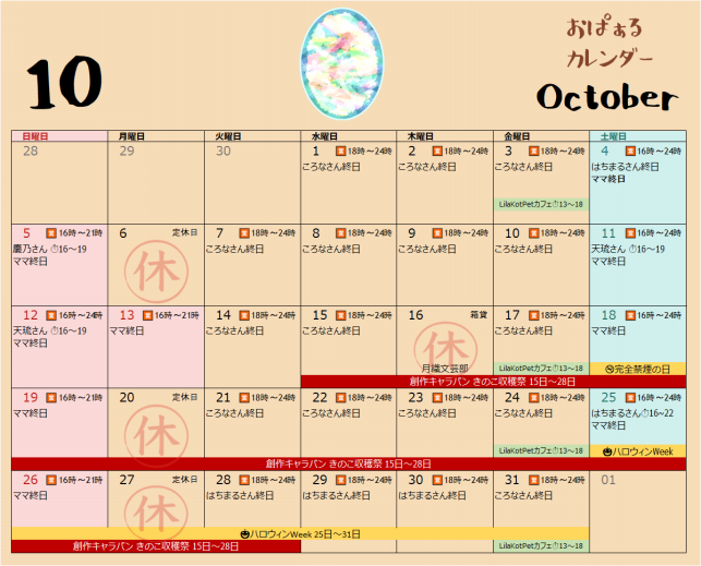 おぱぁるの10月は、お休みが6日(月)、16日(木)、20日(月)、27日(月)の予定です。