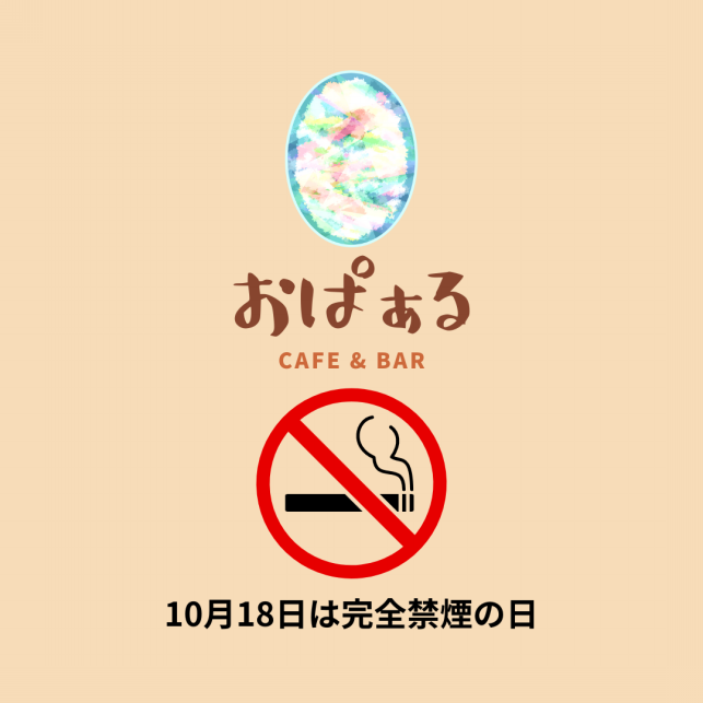 10月18日は完全禁煙の日です 2025年10月17日 最終更新日時 : 2026年1月22日 cafebaropal 10月18日のおぱぁるは完全禁煙の日とさせていただきます。 電子たばこも含めて、禁煙へのご協力をお願いいたします。 FacebookXBlueskyHatenaCopy