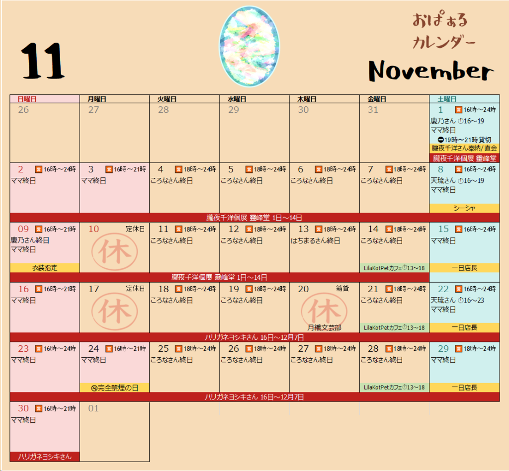 おぱぁるの11月は、お休みが10日(月)、17日(月)、20日(木)の予定です。