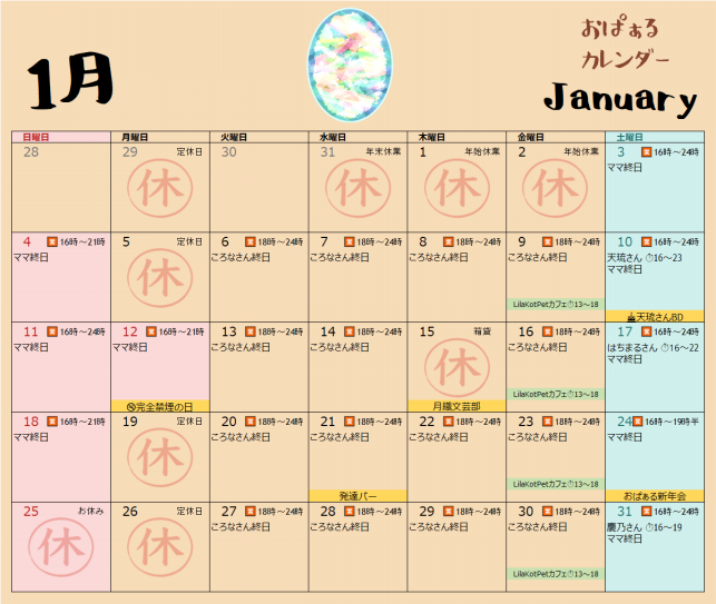 おぱぁるの年末年始は31日~2日がお休みで、3日から営業いたします。